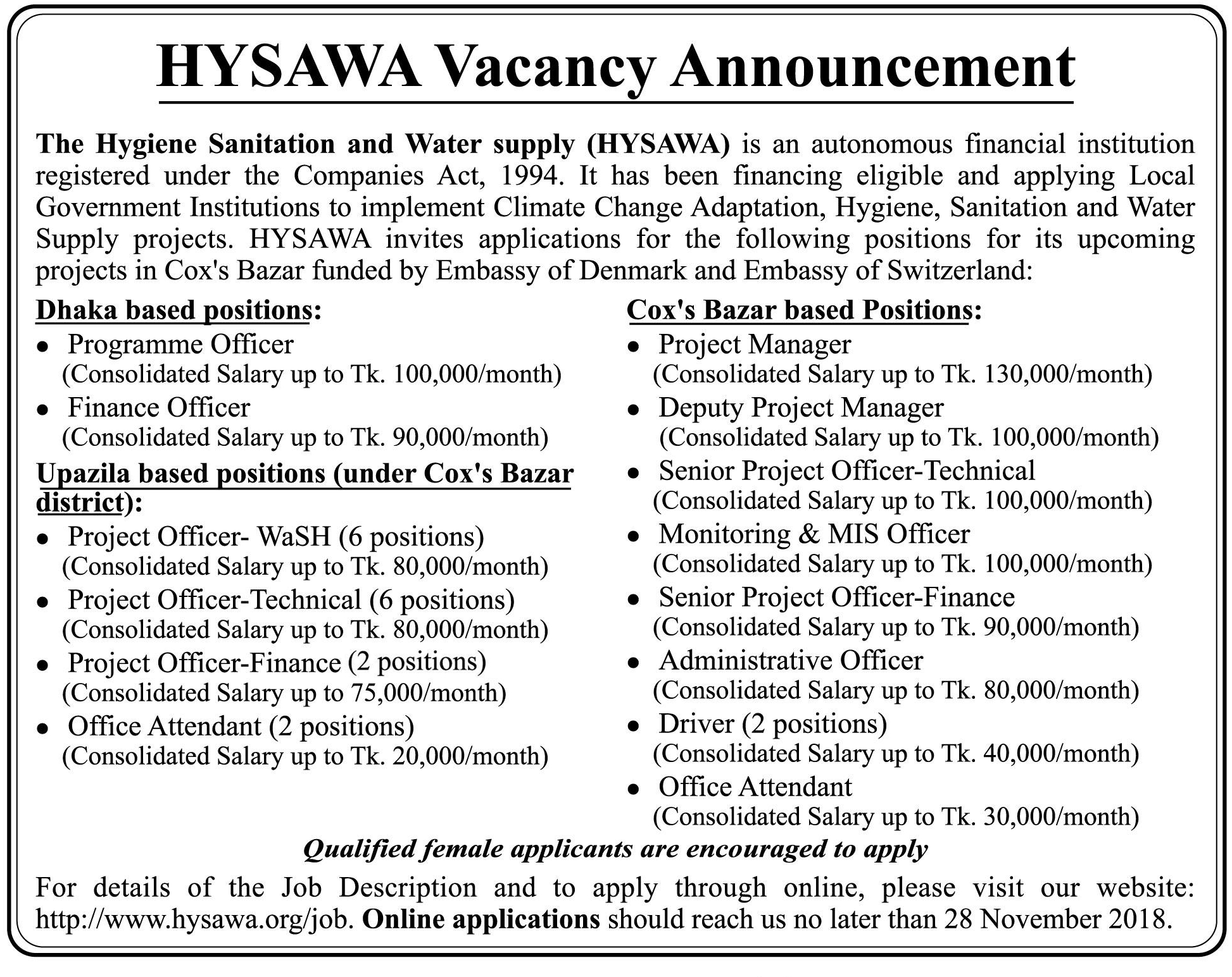 HYSAWA (Hygiene, Sanitation and Water Supply) is a non-profit financing organization, registered under the Companies Act, 1994. Established in 2007, the organization primarily aims at mobilizing resources for and supporting capacity development of local governments and communities to empower them to manage decentralized WatSan services in Bangladesh.